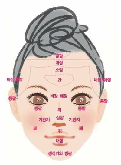 한의학적으로 얼굴의 각 부위는 오장육부에 해당하는데, 이마는 폐, 턱과 귀는 콩팥, 코는 대장, 눈과 혀는 심장, 입술은 자궁을 나타낸다.